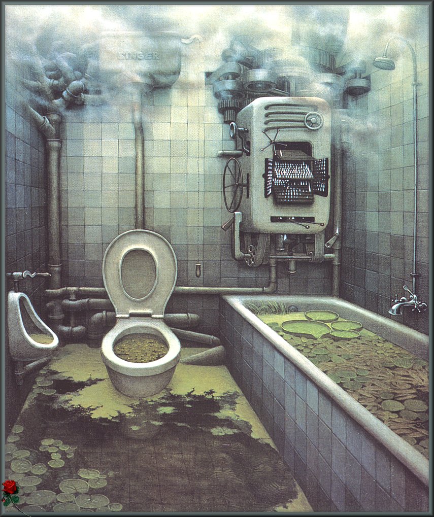 Os modelos mais antigos, folheados a ouro, sem o mecanismo de ducha, resplandecem com tanta nobreza agora que estão aposentados, que é natural perguntar-se se algum dia chegaram mesmo a ser usados, e qual bunda foi capaz de sentir-se à vontade de verdade ali – como quando nos encontramos em certos ambientes que de tão limpos torna-se difícil nos sentirmos à vontade neles. Nos banheiros das casas hodiernas, bem menos espaçosas que os templos antigos, as grandes mansões e palacetes, é obrigatório que o cagante sinta-se à vontade, posto que muitos consideram um tanto dispendiosa a tarefa de defecar e de limpar-se em tronos alheios.